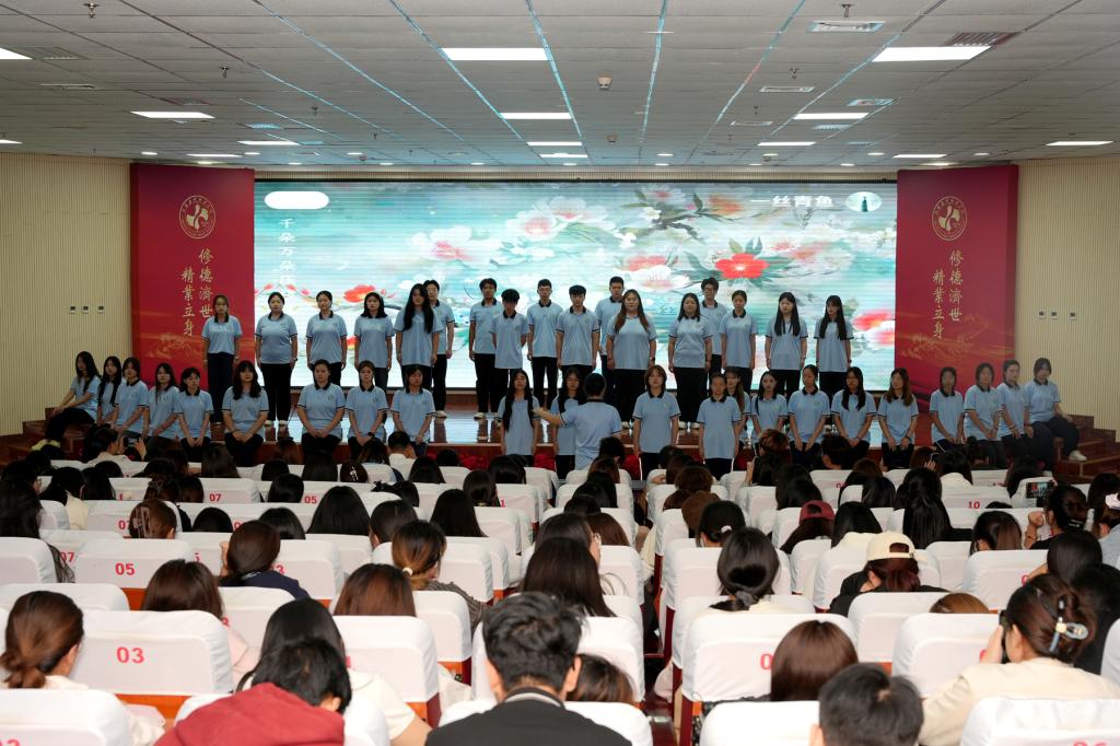 展示活动中,师生们以饱满的热情、标准的语言尽情演绎经典篇目,展示师生才艺。由素质教育教学研究部王晶老师指导的歌伴舞《菩萨蛮》、男声四重唱《月满西楼》、二声部合唱《江畔•独步寻花》,同学们化身诗词使者,用朗诵、歌舞等形式,带领大家穿越时空,领略经典诗词的魅力。制药系师生朗诵《雅韵华章巾帼新声》,声情并茂展现古今巾帼故事。药学系吟诵《非遗里的中国》,别具匠心,将非遗项目与经典诗词巧妙融合。化妆品医美系《颂经典文化传千年文明》、食品系《蒹葭》、医疗器械系《承雅言薪火・诵经典华章》、播音主持协会《总有一天》、中药系《中药歌诀》、《红色家书》等吟诵节目,或庄重肃穆,或清新婉约,生动诠释经典作品独特魅力,赢得现场观众热烈掌声。