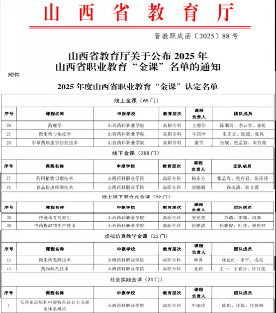 近日,山西省教育厅正式公布了2025年山西省职业教育“金课”认定名单,我院凭借扎实的课程建设与教学改革成果,共有10门课程成功入选,涵盖线上、线下、线上线下混合式、虚拟仿真教学和社会实践五大类型,展现了学院在职业教育课程建设方面的综合实力与创新活力。