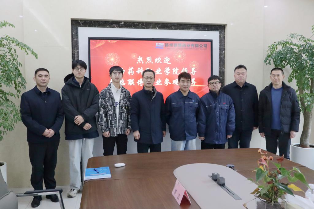 校企携手育新才,产教融合谱新篇。近日,学院党委副书记、院长关伟带队前往扬州联博药业有限公司(以下简称“联博药业”),亲切看望正在进行综合实训的学生,并就深化校企合作进行交流洽谈。学院教务部(教师工作部)、产教融合中心(对外交流中心)、药学系、制药系相关负责人一同随行走访。联博药业总经理黄庆申热情接待学院一行。公司实训学生代表及学院校友代表共同参加此次活动。