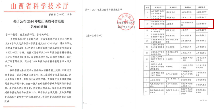 近日,在科研服务中心统筹牵头,宣传统战部、中药系、药学系、食品系通力协作下,我院申报的“中医药标本科普基地”(大健康领域)顺利通过山西省科技厅评审,正式获评2024年度山西省科普基地。